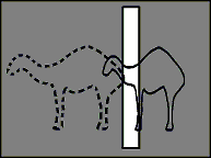背景と目的 人間の視覚機能の一つ一つを解明していくことが,視覚のモデルを構築するアプローチとなる。 ここでは「アノーソスコピック知覚」と呼ばれる,一種の錯視現象を取り上げる。 これは下図左に示すようにスリットの背後を動く図形(破線)を見たとき,線分が 順次呈示されることになる。 この時全体像が知覚でき,その図形が収縮して知覚される(実線の図形)と言う現象である。 これは視覚から入る映像が,なんらかの形で貯蔵されていることを示す現象である。 この現象を解明することにより,視覚刺激と貯蔵の関係を導くことができ,視覚の モデル構築の基礎になろう。この現象を説明するモデルの構築が,本研究の目的である。